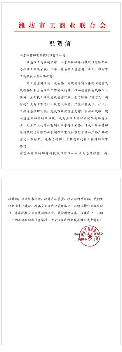 市工商聯(lián)來信祝賀公司董事長(zhǎng)榮獲山東省省長(zhǎng)質(zhì)量獎(jiǎng)