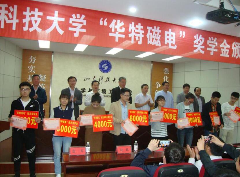 2016年9月28日,值山東科技大學65周年校慶之際,公司常務副總經理、磁電聯盟秘書長劉風亮一行,赴山東科技大學頒發“華特磁電”獎學金并作為理事單位參加了山東省科技大學理事會成立大會?!?br/> 根據公司與山東科技大學簽訂的“華特磁電”獎學金使用辦法,本次獎學金發放給化學與環境工程學院的在校學生。這是公司在山東科技大學頒發的第二屆“華特磁電”獎學金。山東科技大學黨委副書記李道剛,學生工作部、校團委、教務處、合作發展處、化工學院負責人出席會議,會議由化工學院黨委副書記竇存增主持。獲獎學生以及礦物加工工程系教師、研究生、本科生代表參加會議。